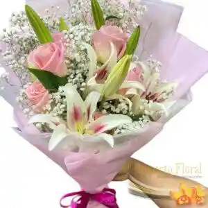 Busquets de lirios, rosa y perla, decoración papel coreano y moño.