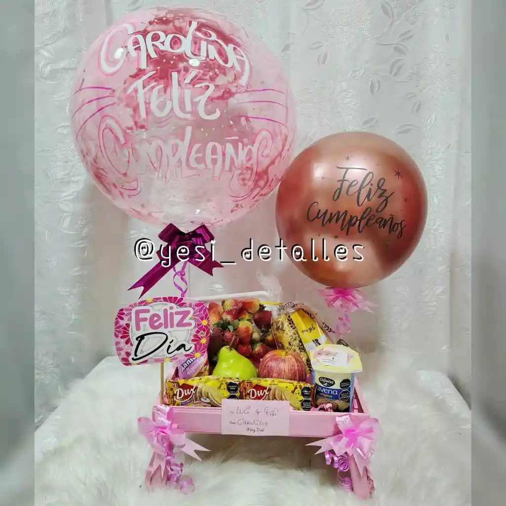 mesa de desayuno para algo o merienda en madera, pastel salado, una bandeja de fruta picada o fresas, dos frutas enteras, una bebida, unas galletas saladas, un maní, un globo látex, un globo burbuja, pin de la ocasión, mensaje personalizado
