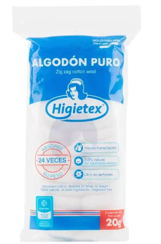 Usos Comunes El algodón Higietex es un producto versátil indispensable en hogares, botiquines de primeros auxilios y entornos hospitalarios: Limpieza de Heridas: Su pureza y capacidad de absorción lo hacen ideal para la limpieza de lesiones y la aplicación de desinfectantes. Cuidado Personal e Higiene Diaria: Se utiliza para la limpieza de la piel, aplicación de productos cosméticos o de cuidado facial, y remoción de maquillaje. Uso Médico y Hospitalario: Es un elemento básico en procedimientos médicos y como apósito absorbente, ya que es un buen protector mecánico y absorbe sangre, mucosidad, pus y otros fluidos. Aplicación de Productos Tópicos: Facilita la aplicación de medicamentos tópicos y otros productos líquidos o cremosos.
