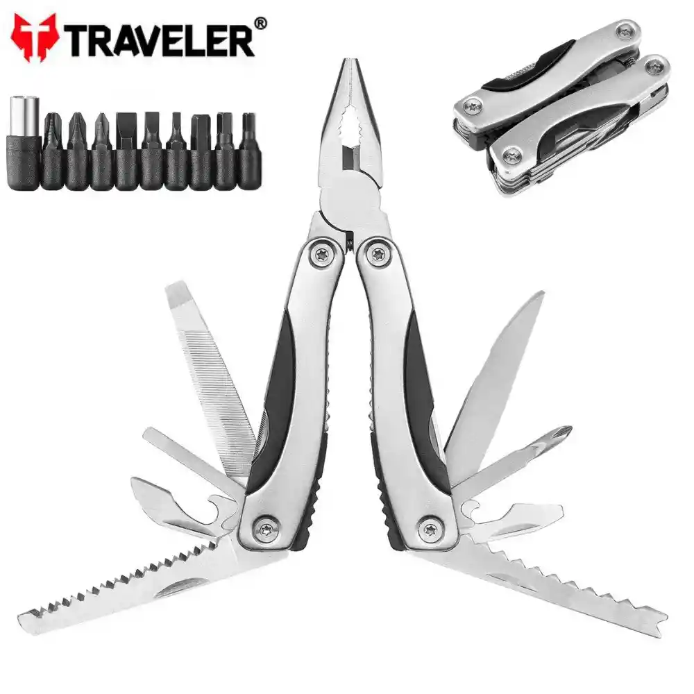 Herramienta compacta y versátil diseñada para ofrecer múltiples funciones en un solo dispositivo. Fabricada en acero inoxidable de alta calidad, combina un alicate, y otras funciones útiles en una estructura resistente y duradera. Ideal para quienes necesitan tener a mano varias herramientas sin cargar con múltiples elementos, esta herramienta es perfecta para actividades al aire libre, reparaciones cotidianas o para el uso en situaciones de emergencia. Su diseño ergonómico facilita el agarre y uso, mientras que su construcción robusta asegura una larga vida útil Incluye 10 Adaptadores de destornillador de diferentes tamaños