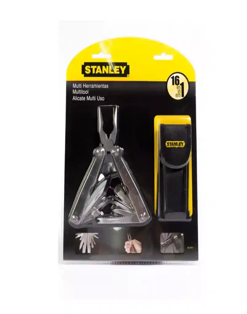 Fabricada en acero inoxidable con pulido espejo - Incluye estuche para portar a la cintura - 16 herramientas en una 16 Funciones (3) Punta Estándar 3.1, 4.1 & 6 mm Destornilladores (1) Punta Torx #1 Destornillador (1) Alicates Punta Larga (1) Alicate Mordaza Curva (1) Cuchilla Grande (1) Cuchilla Pequeña (1) Corte de Alambre (1) Abre Latas (1) Saca Anzuelo (1) Desescamador (1) Regla (1) Lima (1) Escala Métrica (1) Escala en Pulgadas Estuche Si vas de día de campo, casería, pesca o campamento te recomendamos llevar la Multiherramienta STANLEY 16 en 1 Modelo 92-841. Es tan práctica que te evita cargar todas las herramientas que incluye por separado, y de esta forma ahorrar espacio. Su diseño incluye alicate punta larga con corta alambre ideal para tuercas o sujeción de piezas; destornilladores de punta plana (paleta) de 3 medidas, 1/8 (3mm), 14 (6mm) y 5/16 (7.9mm); uno de punta phillips #1; lima, específicamente para deshacer bordes o brindar superficies lisas; una regla, normalmente se usa para medir el área deseada en donde se va a trabajar; Un saca anzuelos muy utilizado para la pesca en la cual es necesario pero no es su único también puede darle otro tipo de usos; Una cuchilla grande y chica con las cuales se podrá cortar fácilmente cualquier tipo de objeto o material.