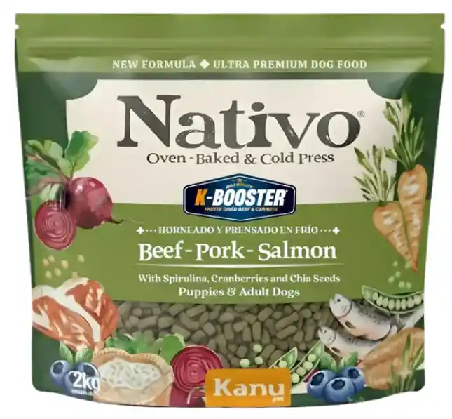 Nativo Oven-Baked de Kanu Pet es un alimento ultra premium horneado y prensado en frío, diseñado para quienes buscan una nutrición natural, real y sin rellenos. Su proceso artesanal conserva intactos los nutrientes y el sabor auténtico de la carne, vísceras y salmón. Cada croqueta ofrece proteínas funcionales y omegas naturales que fortalecen los músculos, la piel y el pelaje, mientras la nuez de sacha inchi, los arándanos y la espirulina aportan antioxidantes, refuerzan las defensas y promueven vitalidad. Enriquecido con probióticos activos, minerales orgánicos y colina natural, mejora la digestión y la absorción de nutrientes.