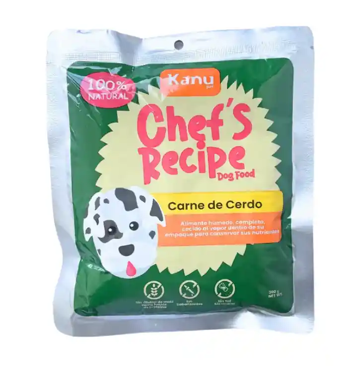Chef's Recipe Carne de Cerdo de Kanu Pet es un alimento húmedo completo, 100% natural y balanceado, ideal para perros de todas las razas a partir del destete. Cocido al vapor dentro de su empaque, este proceso exclusivo conserva todos sus nutrientes esenciales, garantizando una nutrición óptima.