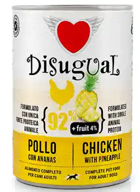 Alimento húmedo completo para perros adultos, con una única fuente de proteína animal (92% carne de pollo) y enriquecido con fruta (4% piña). Sin conservantes, colorantes ni aperitivos artificiales, es una opción natural y equilibrada para el bienestar de tu perro.