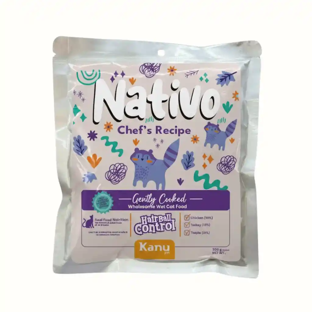 Nativo Hairball Control es una dieta 100% natural, multiproteica y ultra premium, cocida al vapor dentro de su empaque para preservar nutrientes reales y sabor auténtico. Formulada con pollo (30%), pavo (15%) y tilapia (15%), ofrece proteínas magras altamente digestibles que favorecen la vitalidad, la salud muscular y una nutrición equilibrada día a día.