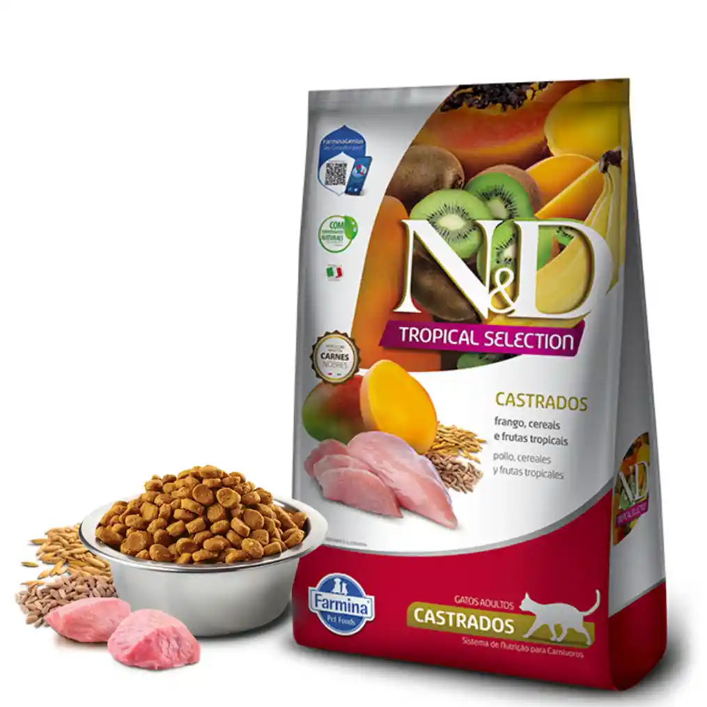 N&D Cat Tropical Frango Adult Castrado es un alimento seco de alta calidad diseñado específicamente para gatos adultos castrados. Con un contenido de proteína bruta del 37%, este producto garantiza una nutrición óptima, ayudando a mantener la masa muscular y la energía necesaria para un estilo de vida activo. Su delicioso sabor a pollo es irresistible para los felinos, asegurando que cada comida sea un momento de placer. Los ingredientes seleccionados, como el pollo, aportan no solo un sabor excepcional, sino también nutrientes esenciales que contribuyen a la salud general de tu gato. Este alimento está formulado para cuidar la salud oral de tu mascota, promoviendo dientes y encías saludables. La línea de productos N&D está diseñada para satisfacer las necesidades específicas de los gatos castrados, ayudando a controlar su peso y mantener un equilibrio nutricional adecuado. El envase es práctico y fácil de almacenar, asegurando que tu gato siempre tenga acceso a una alimentación fresca y nutritiva. Con N&D Cat Tropical Frango, estás eligiendo un producto de Farmina que combina calidad, sabor y salud en cada bocado. Proporciona a tu gato la mejor alimentación para que disfrute de una vida plena y saludable.