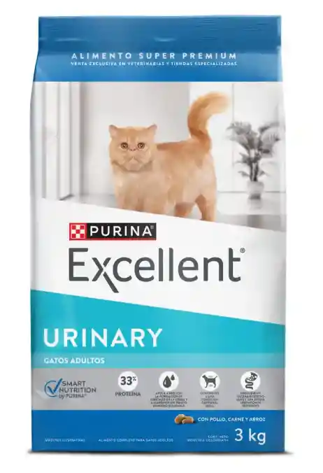 3 Kg PURINA® Excellent® Adulto Urinary Pollo y Arroz, ofrece una nutrición especializada para los gatos con un sistema urinario sensible, formulada a base de proteínas de alta digestibilidad, para ayudar a mantener el tracto urinario saludable y colaborar en reducir la formación de cristales en la orina.