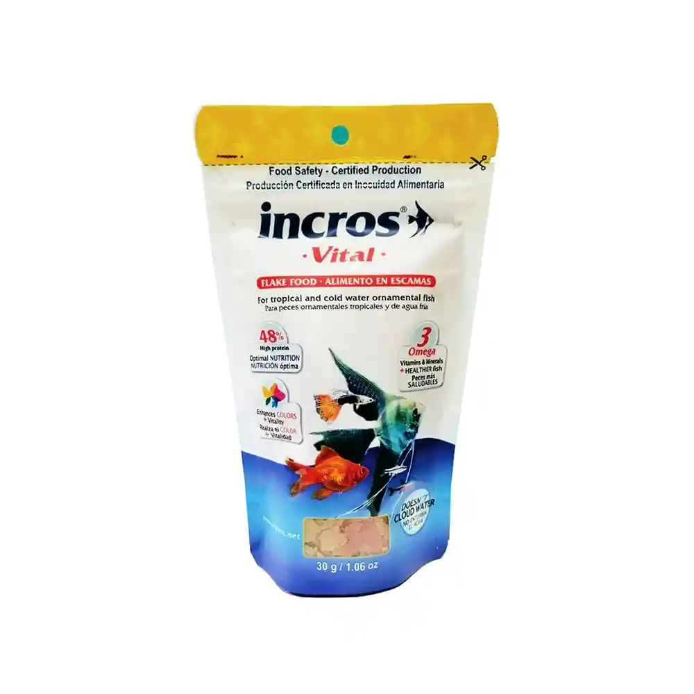 Alimento tipo escamas o flakes, ideal para peces de superficie presentación de 30 gr. Incros Vital es un alimento para peces de agua dulce elaborado en Colombia. Es un alimento de alta calidad e ideal para la alimentación de peces de agua dulce en todas las etapas de la vida. Esta comida para peces es un alimento completo, balanceado, alto en proteína, carbohidratos, aminoácidos, vitaminas y minerales.