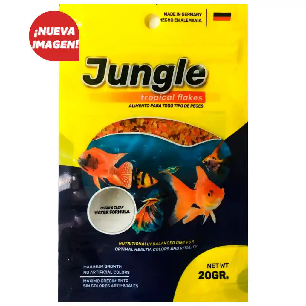 Tetra Jungle es un alimento para peces especialmente formulado y recomendado para pequeños peces de cardumen. Esta comida para peces será ideal para aportar una dieta nutricionalmente balanceada que contribuya a un estado de salud óptimo, colores que resalten y máxima vitalidad. Es una fórmula clean and clear water, así que favorecerá la limpieza del tanque por más tiempo. 14 g.