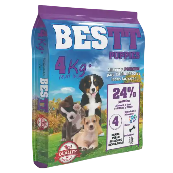 Bestt Dog Puppies, Alimento Premium para cachorros de todas las razas contiene: 24 % Proteína y 4 Ingredientes como carne, pollo, aguacate y remolacha.