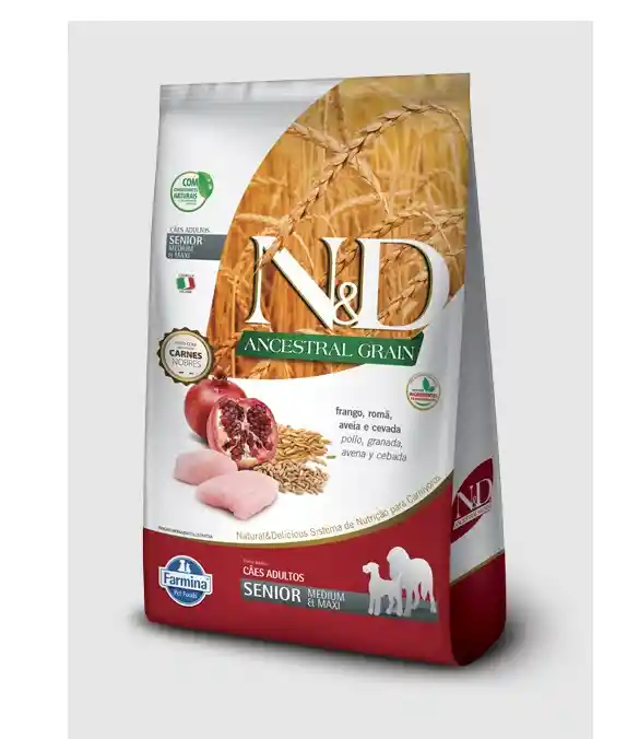 Es Un Alimento Super Premium Y Natural, Formulado Específicamente Para Cubrir Las Necesidades Nutricionales De Perros Adultos Mayores De Razas Medianas Y Grandes. Elaborada Con Pollo Fresco De Alta Calidad, Granos Ancestrales (espelta Y Avena) Y Frutas Naturales, Esta Receta Proporciona Una Nutrición Equilibrada Que Ayuda A Mantener La Vitalidad, La Movilidad Articular Y La Salud General Durante La Etapa Senior. Desarrollada Por Farmina N&d, Esta Línea Combina La Ciencia Y La Naturaleza, Utilizando Ingredientes Funcionales Sin Conservantes Artificiales Ni Colorantes, Garantizando Una Alimentación Saludable Y Deliciosa Para Tu Perro. Características Especialmente Formulada Para Perros Senior (mayores) De Razas Medianas Y Grandes. Con Pollo Fresco Y Deshidratado Como Fuente Principal De Proteína Animal, Altamente Digestible Y Sabrosa. Incluye Granos Ancestrales (espelta Y Avena), Que Aportan Energía Sostenida Y Mantienen Niveles De Glucosa Estables. Enriquecida Con Frutas Y Vegetales Naturales Como Granada, Manzana Y Espinaca, Que Aportan Antioxidantes Y Vitaminas. Contiene Glucosamina Y Condroitina, Que Favorecen La Salud Articular Y La Movilidad En Perros Mayores. Libre De Colorantes, Conservantes Artificiales Y Organismos Genéticamente Modificados (gmo Free). Equilibrio Óptimo De Omega-3 Y Omega-6, Minerales Quelados Y Antioxidantes Naturales Para Proteger Las Células Del Envejecimiento. Fabricada En Italia Bajo Estrictos Estándares De Calidad, Con Ingredientes De Grado Humano Y Cocción A Baja Temperatura. Beneficios Favorece Una Digestión Saludable, Gracias Al Aporte De Fibras Naturales, Prebióticos (fos Y Mos) Y Proteínas De Alta Calidad. Apoya La Salud Articular Y Ósea, Ideal Para Perros Mayores De Razas Medianas Y Grandes Que Requieren Soporte Adicional. Mantiene La Función Cardíaca Y Circulatoria, Gracias A Los Ácidos Grasos Esenciales Y Antioxidantes Naturales. Contribuye Al Bienestar Cognitivo Y La Vitalidad Mental Mediante Dha Y Nutrientes Neuroprotectores. Promueve Un Pelaje Brillante Y Piel Saludable Con Aceite De Pescado, Linaza Y Biotina. Preserva La Masa Muscular Magra Mediante Un Balance Óptimo De Proteínas Y Energía Controlada. Ayuda A Mantener Un Peso Saludable, Ideal Para Perros Mayores Con Menor Nivel De Actividad Física. Ingredientes Principales Pollo Fresco Deshuesado (mín. 20%) Pollo Deshidratado (mín. 18%) Grasa Animal (de Pollo) Avena Y Espelta Pulpa De Remolacha Deshidratada Aceite De Pescado Proteína De Huevo Deshidratado Linaza Frutas Y Vegetales (granada, Manzana, Espinaca, Naranja) Glucosamina Y Sulfato De Condroitina Extractos Naturales De Cúrcuma, Aloe Vera Y Té Verde