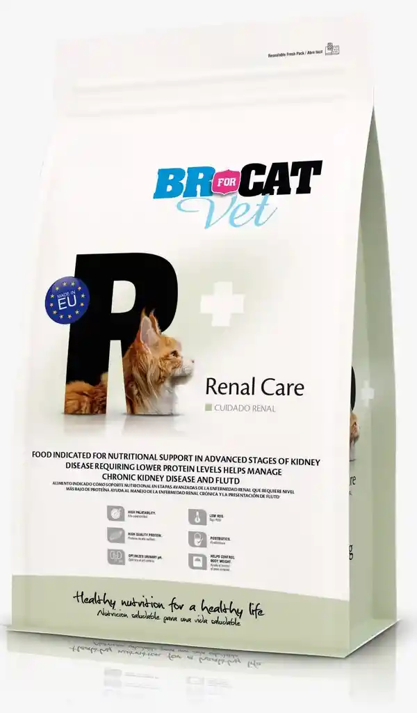 BR FOR CAT VET CUIDADO RENAL es un alimento completo para suministrar a gatos adultos de todas las razas en estados avanzados de la enfermedad renal que requieren bajos niveles de proteína.