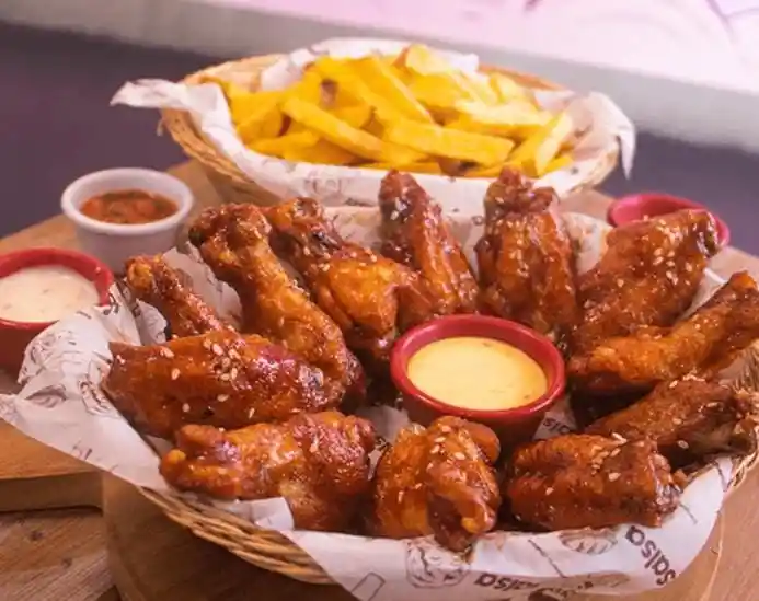 900 gr de alitas bañadas en salsa BBQ o miel mostaza, acompañadas por papas