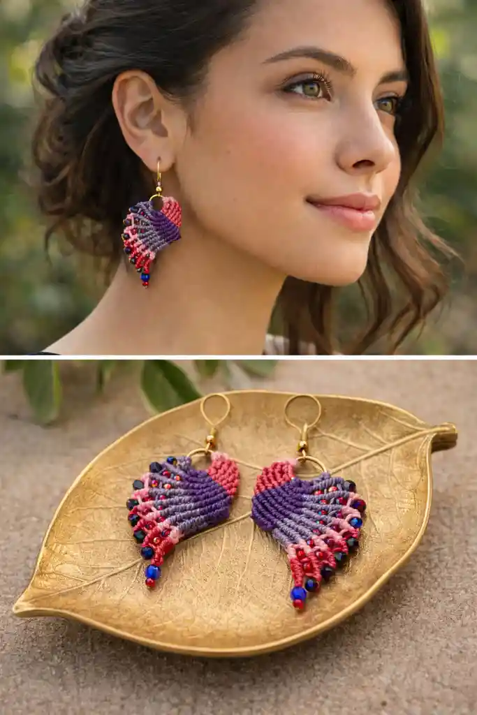 Aurora Boreal en tus oídos ✨ Déjate envolver por la magia del color y la delicadeza artesanal con nuestros aretes Alitas tejidos a mano en micro macramé 💖 🌿 Diseño inspirado en alas, ligero, orgánico y lleno de vida 🧵 Tejidos a mano con hilo encerado de alta calidad 🔗 Gancho tipo catalán en acero inoxidable, cómodos y seguros 💎 Detalles en chaquiras y cristales que capturan la luz 📏 5 cm tejido | 6 cm total 🎨 Tonos: rosa, fucsia, morado y lila que evocan la belleza de una Aurora Boreal Cada par es único, hecho con dedicación y amor 💫 Ideal para mujeres que buscan un accesorio elegante con esencia natural y un toque artístico 🌸 No es solo un accesorio… es una expresión de tu estilo y tu esencia 📩 Escríbeme y lleva contigo una pieza exclusiva hecha a mano ✨ ¡Disponibles por tiempo limitado! ✨