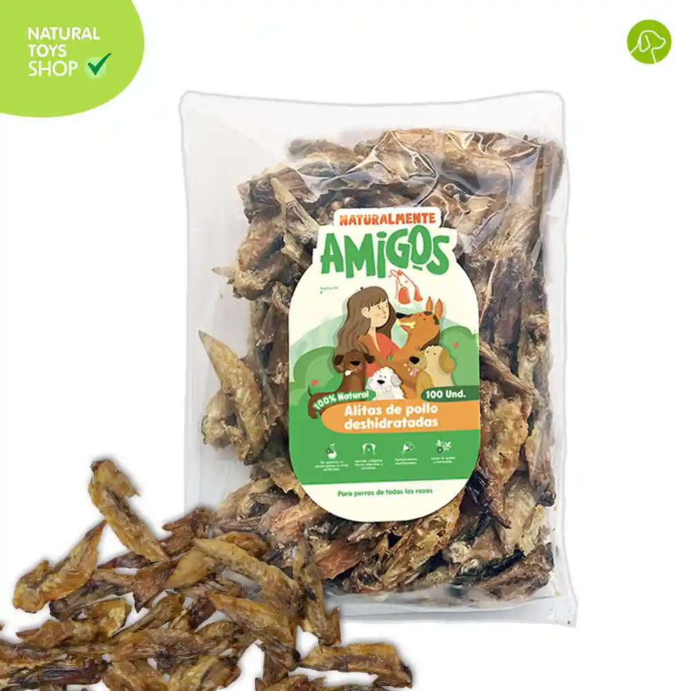 Exquisitas y Crocantes Alitas (Wingz) de Pollo para tu perro. Nuestras Wingz son naturales, están deshidratadas y cuentan con un proceso en el que eliminamos todo tipo bacterias Son reales, No Carnaza 100% Pollo cada Alita conserva el sazón que obtiene de la piel del pollo. Tienes que tenerlas para que tu mascota disfrute el Cronch y delicioso sabor a Wingz. También: - Sin conservantes ni Preservativos químicos. - Sin bacterias. - Sanos para su organismo y digestión. Tiempo máximo de consumo 12 meses. El producto está listo para su consumo, una vez abierto se recomienda consumirlo en el menor tiempo posible. Almacenar el producto en su empaque original a temperatura ambiente, en un lugar seco y fresco. Evitar que el producto quede expuesto en lugares donde hay bichos y moscas que se le pueden prender y a su vez contaminarlo. Notas: * Ideal para Perros de todas las razas con más de 6 meses de edad. * Razas medianas y grandes 3 unidades al día. * Razas pequeñas 2 unidades al día. Son Snacks Naturales para Mascotas, Snacks Naturales ideales para Perros, sirve como complemento del alimento para perros, comida para perros, es un complemento nutricional para mascotas. Comestibles Naturales para mascotas. Comestibles para perros. Se usa como comida para mascotas por los beneficios adicionales que contiene pero No reemplaza la comida tradicional. Somos Natural Toys: Snacks, Deshidratados y Huesos Naturales para Mascotas. "Del campo al paladar de tu mascota”