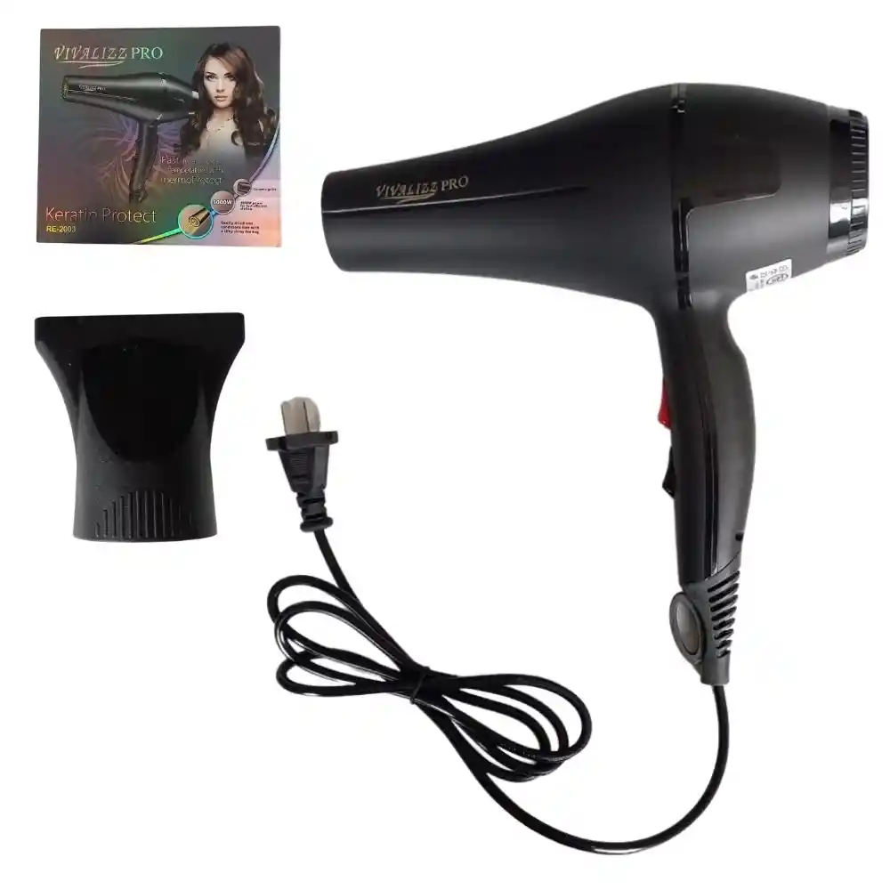 El secador de cabello profesional VIVALIZZ PRO RE-2003 te ayudará a realzar tu belleza en tan solo minutos ayudándote a realizar peinados elaborados, o un sencillo secado. Ideal para peluquerías, estilistas y para uso personal. Equipado con un motor de alto rendimiento con tecnología para distribuir el calor de manera uniforme y de esta manera obtener mejores resultados. CARACTERÍSTICAS 2 velocidades. 3 graduaciones de temperatura. Filtro para entrada de aire. Rejilla de cerámica Anillo para colgar Seca suavemente y acondiciona el cabello con una sensación sedosa y brillante. Secado rápido a baja temperatura con termo protector Diseño de sonido silencioso, la entrada grande reduce la inversión ciclónica haciendo que el sonido sea más silencioso que un secador de pelo normal. Potencia de 3000 W para un estilo rápido y eficiente. Corriente eléctrica: 220V / 50Hz CONTENIDO 1 secador de Cabello VIVALIZZ PRO RE-2003 1 boquilla