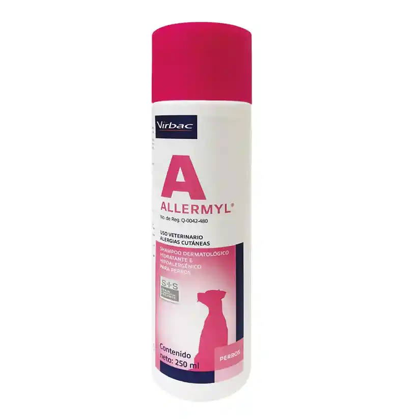 Allermyl® es un shampoo dermatológico de uso veterinario formulado especialmente para perros con piel sensible, alérgica o con irritaciones crónicas. Su fórmula avanzada hidrata, limpia suavemente y ayuda a restaurar la barrera cutánea, aliviando el picor y la inflamación. Beneficios: Alivia alergias cutáneas e irritaciones Fórmula hipoalergénica, ideal para pieles sensibles Con tecnología S-I-S (Skin Innovative Science) para proteger la barrera cutánea Hidratante y suave: uso frecuente sin resecar Mejora la calidad del pelaje y la salud de la piel Indicaciones: Dermatitis atópica o alérgica Prurito, enrojecimiento o piel escamosa Mantenimiento dermatológico en perros con piel reactiva Presentación: Envase de 250 ml Uso exclusivo en perros Modo de uso: Aplicar sobre el pelaje húmedo, masajear, dejar actuar 5–10 minutos y enjuagar. Repetir según indicación veterinaria.