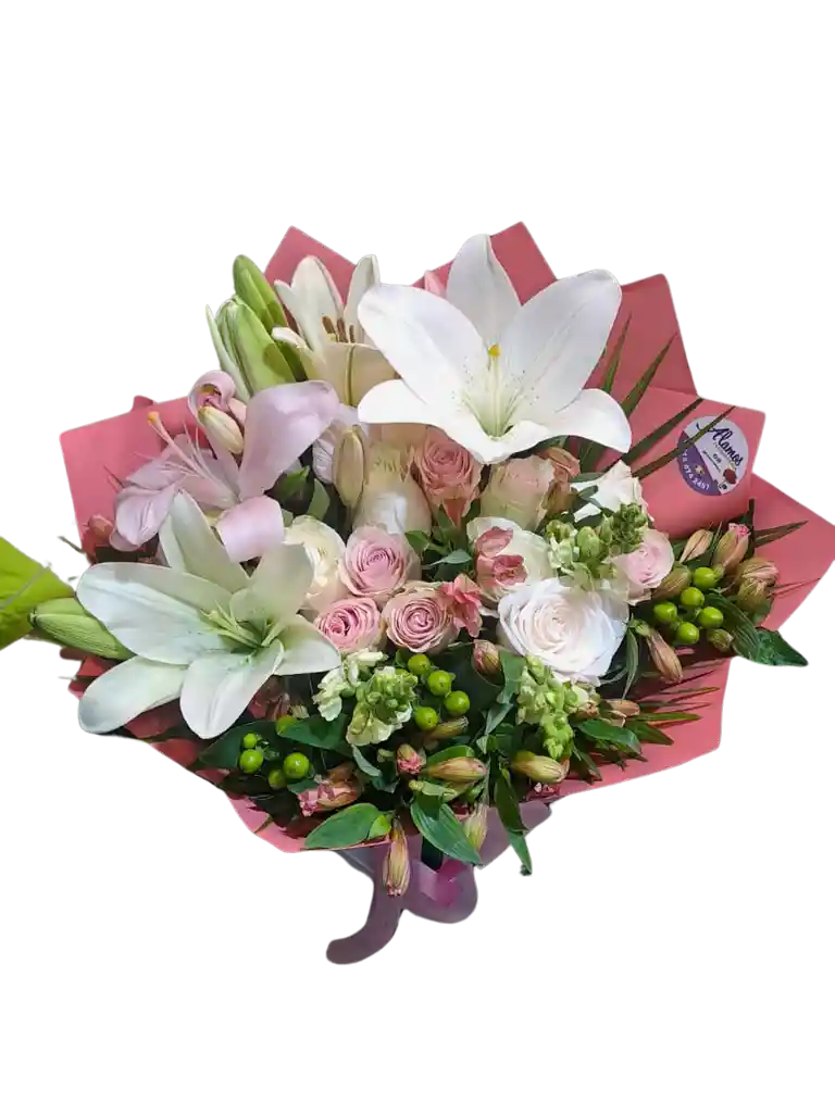 Lirios blancos y rosados, rosas rosadas y hypericum verde reunidos en un bouquet de serena elegancia. Para obsequiar a quien lleva la belleza por dentro (incluye tarjeta personalizada)
