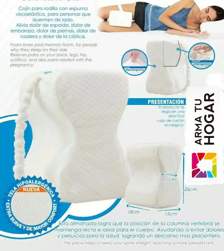 Cojín para rodilla con espuma viscoelástica, para personas que duermen de lado. Alivia dolor de espalda, dolor de embarazo, dolor de piernas, dolor de cadera y dolor de la ciática. Esta almohada logra que la posición de la columna vertebral se mantenga recta e ideal para el cuerpo. Ayudando a evitar dolores y perjuicios para la salud, logrando un descanso mas placentero. Tela lavable con cremallera. Medidas Almohada: Ancho: 26 cm Largo: 18 cm Alto: 15 cm Peso: 400 gramos Medida empaque: Ancho: 26 cm Largo: 18 cm Alto: 15 cm Peso: 400 gramos