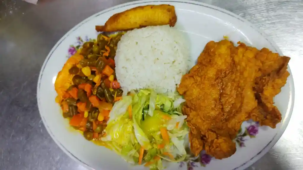 arroz, chuleta de cerdo, verdura frijoles, pasta, lenteja, blanquillos papa a las francesa carne asada chicharron, cerdo asado chuleta de cerdo