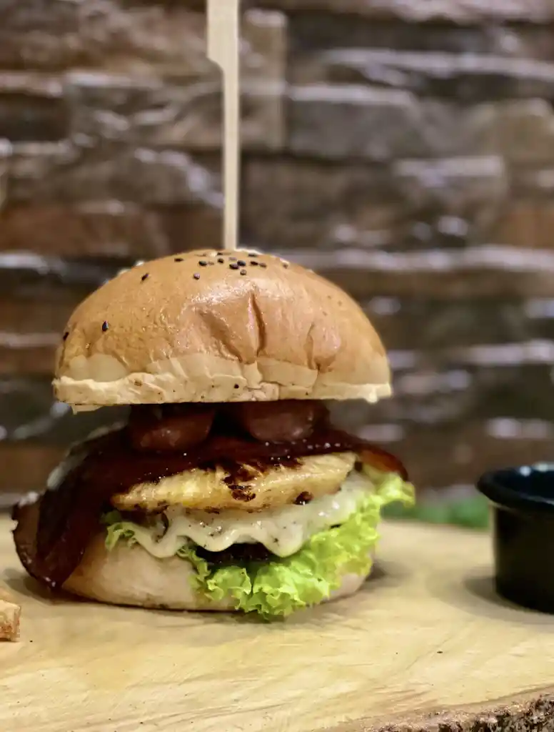 150 gr carne de res, chorizo artesanal, piña rostizada, lechuga crespa, tomates aromatizados, cebolla, chimichurri de la casa, mayonesa de ajo, queso mozzarella. + Papas Cascos