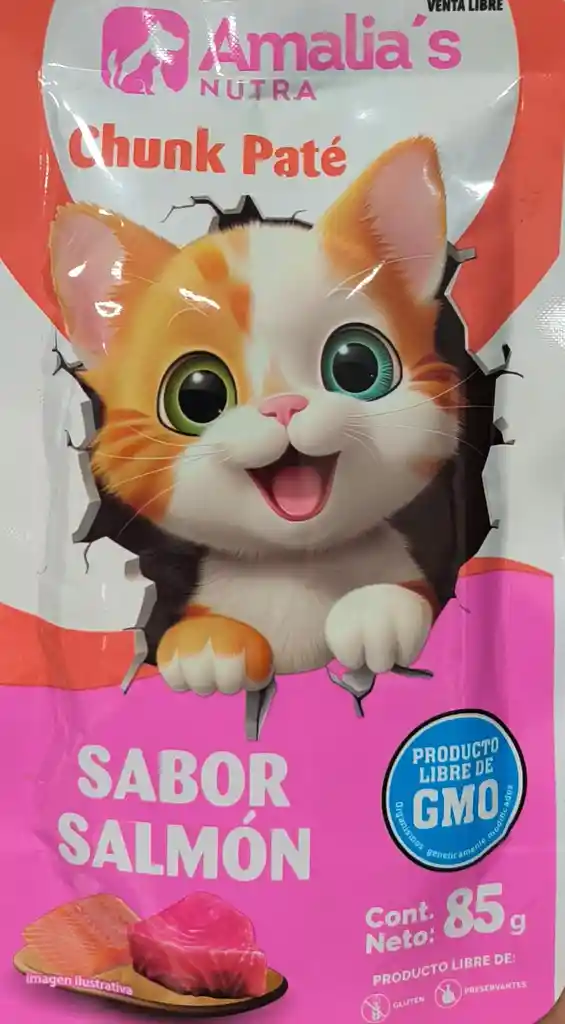 Atún (Thunnus albacares), agua suficiente para el proceso, proteína texturizada de soya, estabilizante. (Gome lanthan), premezcla de vitaminas y minerales, suplemento vitamínico (A, D3, E, K, B12, C) Niacina, Aido Pantoténico, piridoxina, riboflavina, tiamina, biotina, ácido fólico, cloruro de colina. Suplementos minerales: Slato Zinc, sulfato de manganeso, sulfato ferroso, yodato de calcio, selenito de sodio, sulfato de cobre. Aditivos: laurina, lisina, metionina, treonina, vehículo CSP, sabor natural a salmón, colorante natural caramelo.