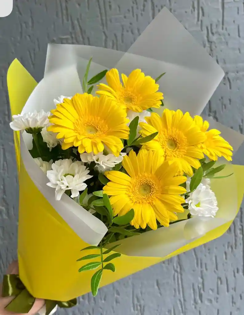 BOUQUET DE GERBERAS CON FOLLAJE ARREGLADO CON PAPEL O TELA Y ATADO CON UNA CINTA