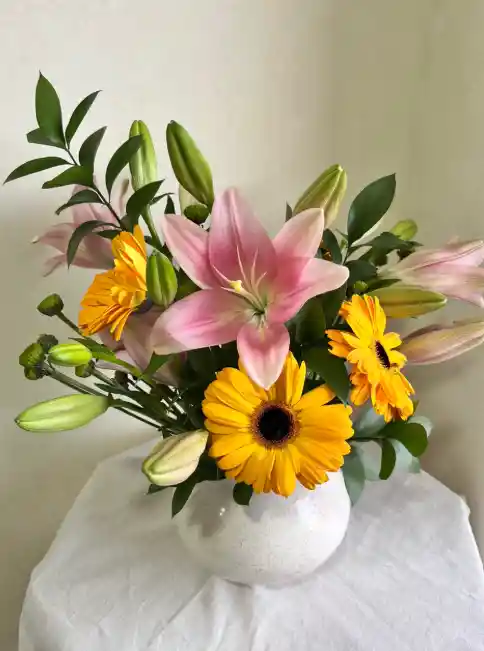 5 lirios + 5 Gerberas + Ruscus + pinocho Incluye jarrón