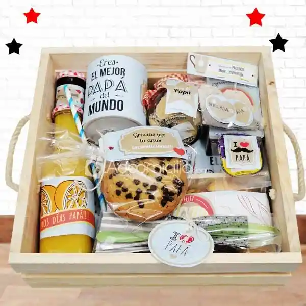 DESAYUNO SORPRESA COMPUESTO POR HUEVOS AL GUSTO, BEBIDA FRIA (JUGO), BEBIDA CALIENTE (CAFÉ EN LECHE), PORCION DE FRUTA, PAN DEL MOMENTO, CUPCAKE O GALLETA, CAJA DE MADERA, MOÑO Y TARJETA.