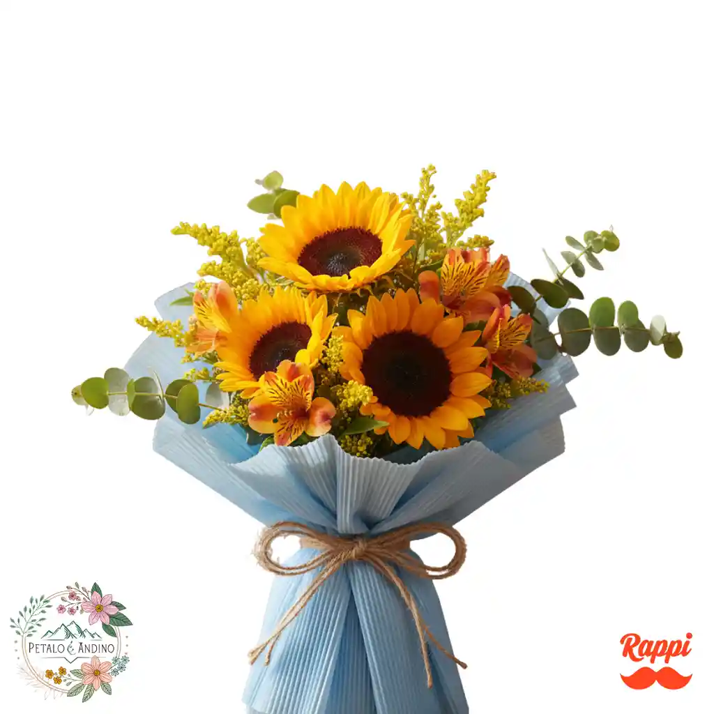 Un detalle lleno de luz y energía. Amanecer Bogotano combina la alegría de los girasoles con la frescura del eucalipto, creando un ramo sencillo pero encantador, ideal para regalar buenos días y sonrisas.