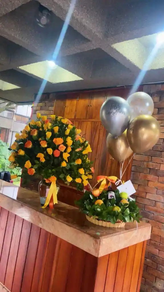 Un imponente arreglo de rosas amarillas y naranjas en jarrón, lleno de luz y energía, acompañado de una canasta frutal con globos dorados para celebrar con alegría y abundancia. Perfecto para cumpleaños o felicitaciones especiales.