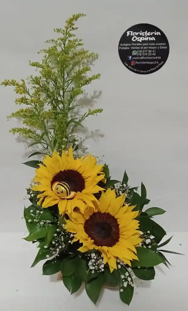 Arreglo floral elaborado con dos girasoles, follaje y un chocolate en una base de madera. Deja tu mensaje para personalizar tu tarjeta.