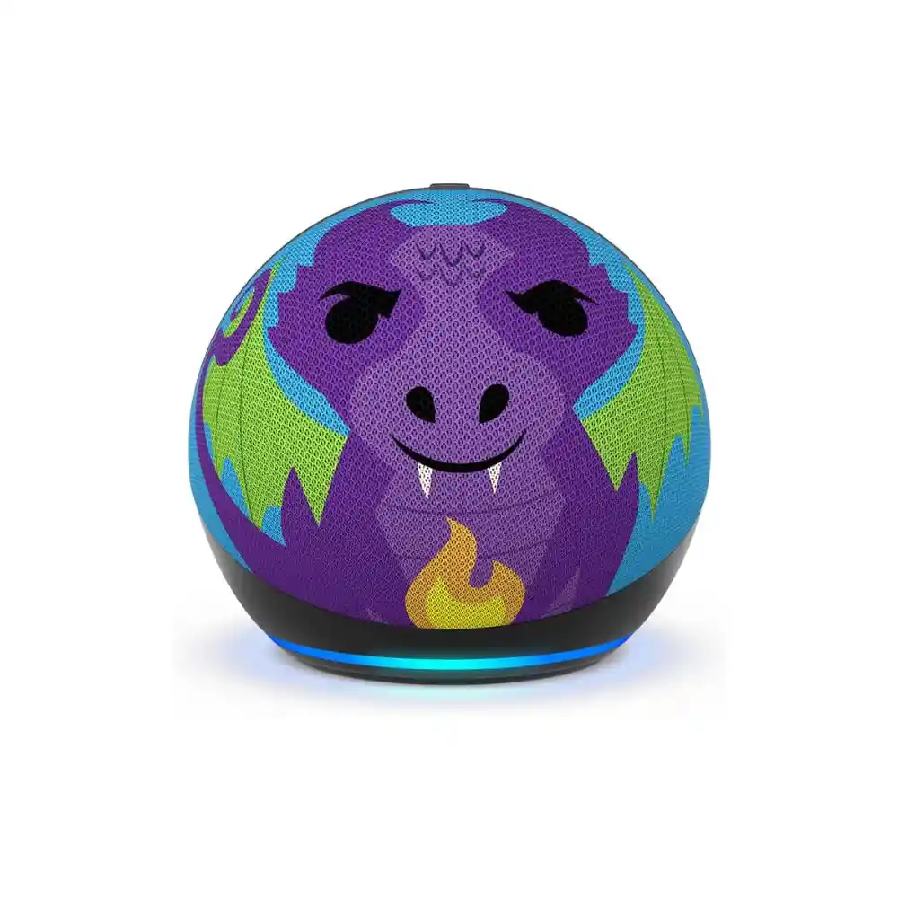 Nuevo Echo Dot Kids – Nuestro parlante con Alexa más popular y adorable, diseñado para niños (no es un juguete). El parlante mejorado proporciona voces más nítidas, así como un sonido detallado y vibrante. Donde el aprendizaje se une a la diversión – Los niños pueden pedirle a Alexa que ponga música, que lea un cuento para dormir, que los ayude a hacer la tarea y más. Reproduce canciones por streaming en Amazon Music, Apple Music, Spotify, entre otros. Controles parentales fáciles de usar – Alexa dará respuestas aptas para niños automáticamente y filtrará las canciones explícitas. También puedes establecer límites de tiempo diarios y revisar la actividad en el Parent Dashboard de Amazon. Mayor independencia – Los pequeños del hogar toman el control de sus rutinas con Alexa, ya que pueden establecer sus propias alarmas, apagar luces inteligentes compatibles, así como llamar a familiares y amigos aprobados. Convierte la voz de Alexa en la de un dragón – Los niños pueden personalizar la manera como Alexa suena con una voz simulada de un dragón, además de escuchar canciones, chistes y datos curiosos inspirados en personajes específicos. Diseño que protege tu privacidad – Amazon no se dedica a vender la información personal de tu familia a terceros. Cuenta con varias capas de controles de privacidad, incluyendo un botón para desactivar los micrófonos.