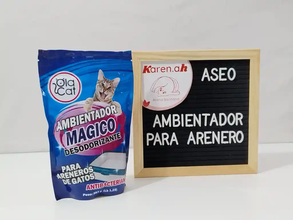 Ambientador desodorizante para areneros de gatos, ayuda a eliminar malos olores, contiene bicarbonato de sodio y fragancia. No es toxico. Peso 567gr.