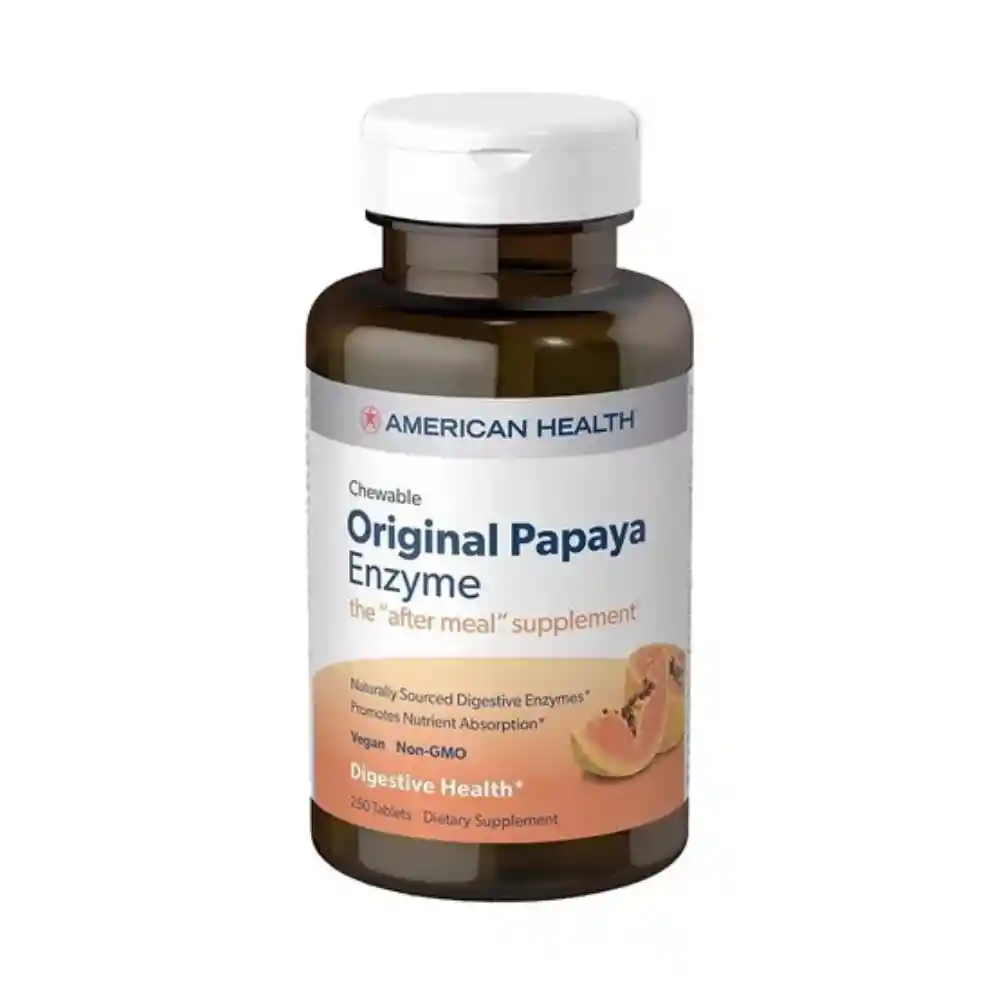American Health tabletas masticables de enzima original de papaya. 250 unidades. Ayuda a la salud digestiva. Promueve la absorción de nutrientes. Característica del material: Vegano. Ingredientes: Sacarosa, carbonato de calcio, ácido esteárico vegetal, estearato de magnesio vegetal, almidón de maíz, sabores de papaya. Información de seguridad: Si está embarazada, amamantando o tomando algún medicamento, consulte a su médico antes de usarlo. Suspenda su uso y consulte a su médico si se produce alguna reacción adversa. Instrucciones: Para los adultos, mastique tres (3) tabletas después de las comidas. Los comprimidos se pueden masticar o tragar. Como recordatorio, analice los suplementos y medicamentos que toma con sus proveedores de atención médica.