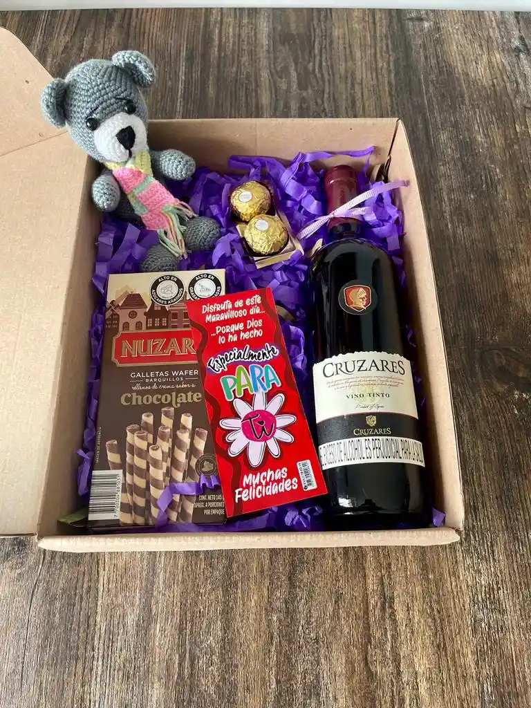 Nuestraamigurumi Box Incluye:Botella De Vino Tinto 750Ml ( Don Simon O Cruzares ), 1 Lata Barquillos Nuzart 150G, 1 Amigurumi (Tejido A Mano) 21 Cm, 2 Bombones Ferrero Rocher, Caja, Papel Picado, Moño Y Tarjeta (De: Para:) La Caja Se Envia En Una Bolsa Sellada Con Sticker Alusivo A La Celebración. Tarjetas disponibles: Cumpleaños,Amor, Feliz Dia, Feliz dia Mujer, Feliz dia hombre, Mamá, Papá., San Valentin.. . .