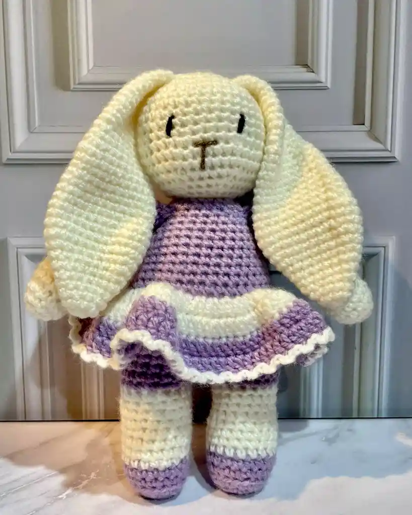 Muñeco coneja de apego tejido a mano con lana antialérgica, mide 25 cm color beige con lila, "mensaje personalizado" dejar mensaje en el chat