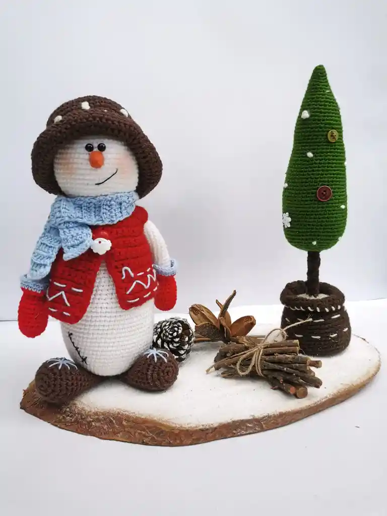 Mide 26 cm de largo acompañado de arbol de navidad, tejido completamente en Crochet incluye todos los articulos de decoración.