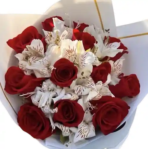 Un bouquet impactante que combina rosas rojas con flores blancas delicadas, creando un contraste elegante y lleno de emoción. Flores frescas de calidad premium, seleccionadas y armadas profesionalmente para un resultado sofisticado y duradero. Algunas flores pueden variar según la disponibilidad de temporada, manteniendo siempre la estética y el valor del arreglo. Incluye tarjeta personalizada sin costo adicional.