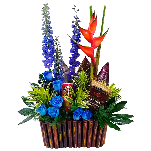 Arreglo en delfinios, heliconia, papas pringle grande, rosas azules, ,manito de dios, botella buchanans