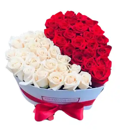 Arreglo en forma de corazón con rosas rojas y blancas, elaborado con flores frescas de alta calidad y un diseño profesional que simboliza pasión y pureza. Algunas flores pueden variar sutilmente según la temporada, manteniendo siempre la elegancia, la frescura y el valor del arreglo. Incluye tarjeta personalizada sin costo para acompañar tu mensaje especial.