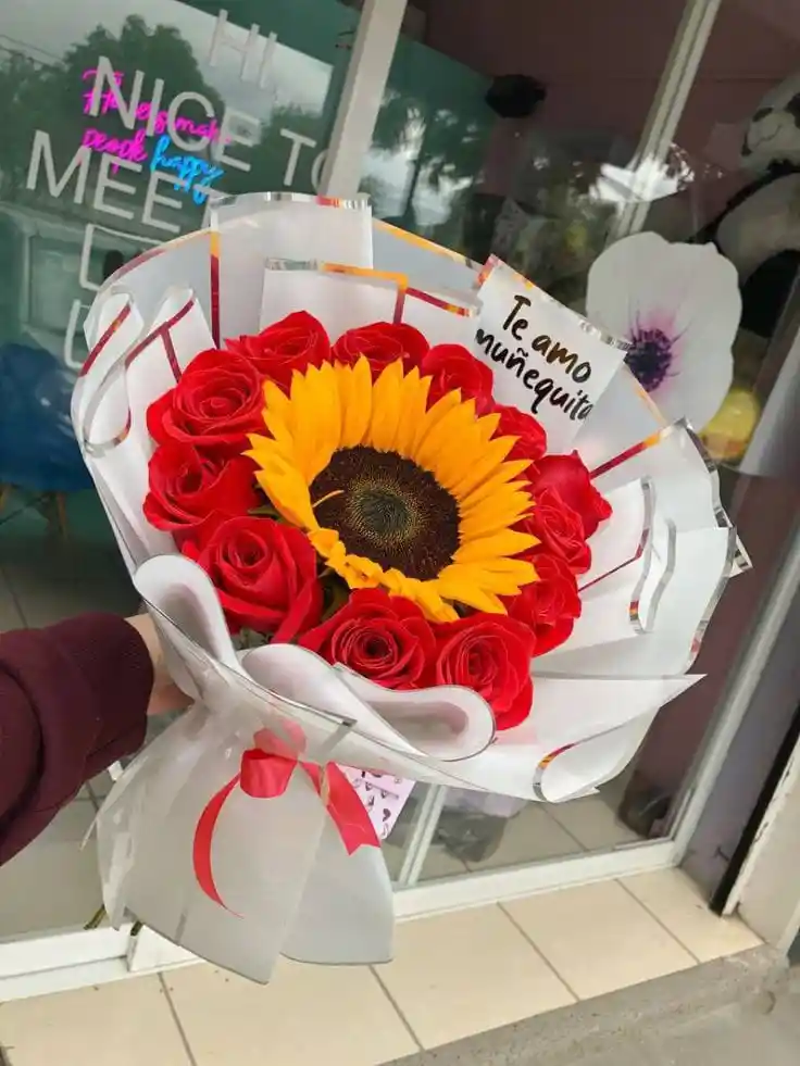 hermoso bouquet con 12 rosas y lindo girasol para regalas