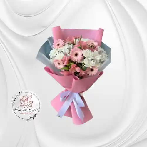 Este hermoso ramo combina la delicadeza de las gerveras rosadas con margaritas blancas, y astromelias rosadas creando una armonía perfecta de ternura y elegancia. ideal para expresar amor, gratitud o felicidad en cualquier ocasión especial. Nota personalizada escribirla en el chat.
