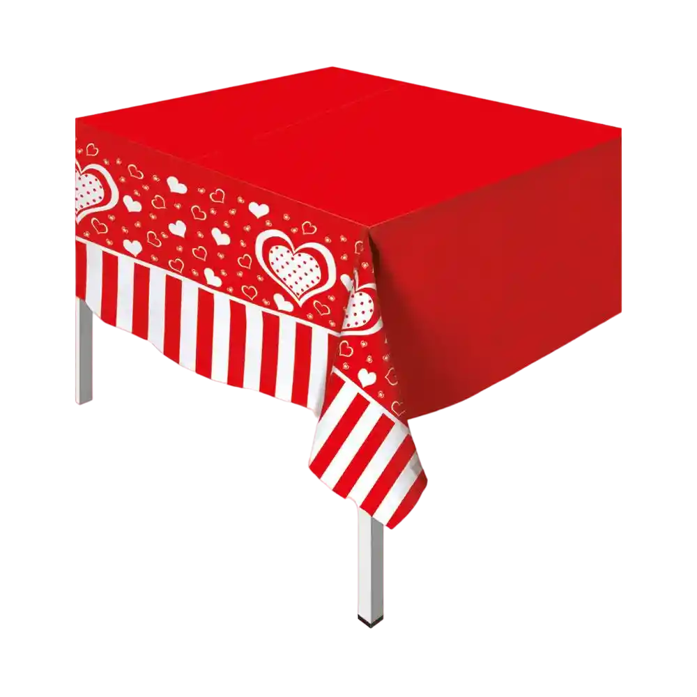 Mantel Plastico Rectangular Rojo de Corazones Blancos, ideal para tu celebraciones de amor