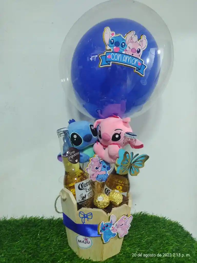 ancheta con pareja de peluches de disney con chocolate ferrero ,cervezas corona y apliques tres de en balde de madera con globo burbuja personalizado