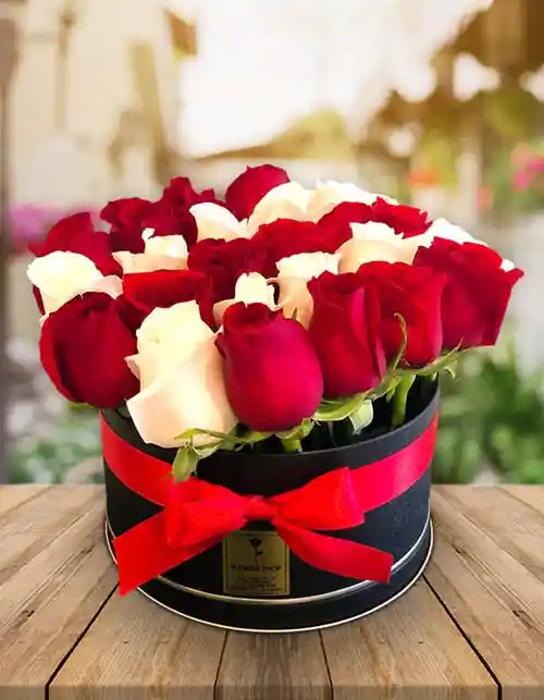 Elegante arreglo con 14 rosas rojas y 10 rosas blancas.