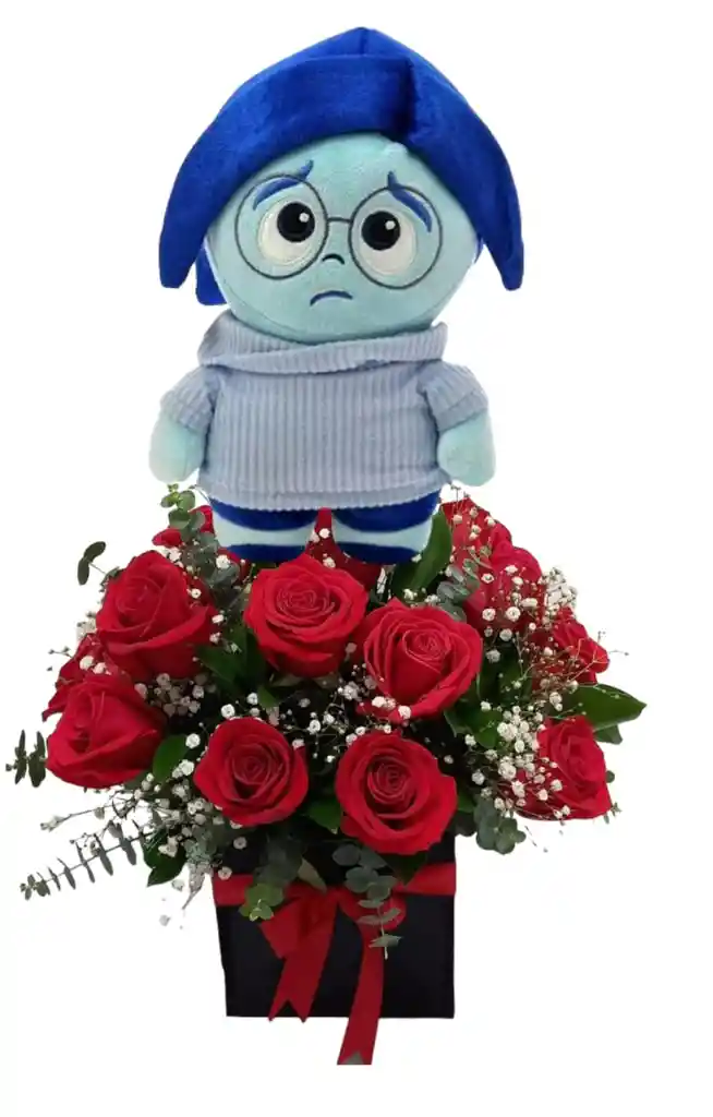 ARREGLO FLORAL CON TRISTEZA 15 ROSAS MAS MUÑECA INTENSA MENTE