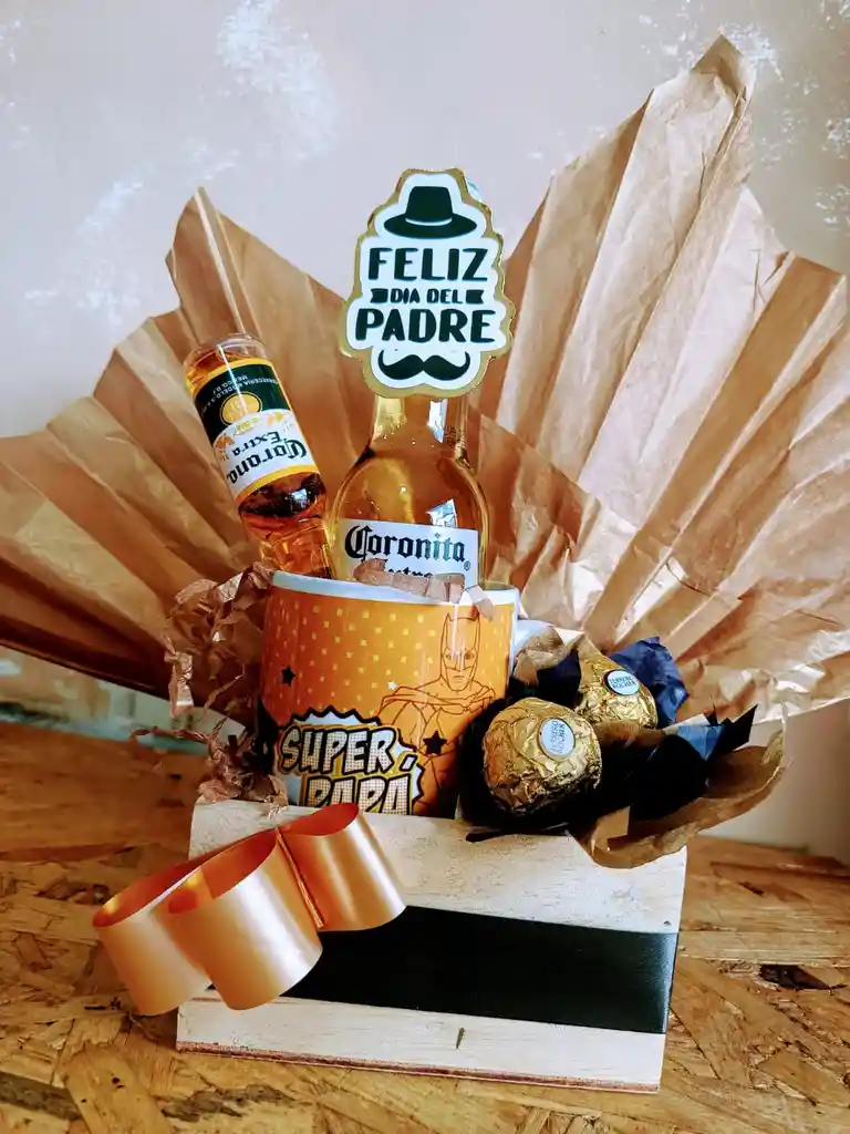 Ancheta feliz día del padre #4, contiene: Cerveza Coronita, vaso de cerámica, dos chocolates ferrero, destapador (Con forma de botellita, puede variar según disponibilidad), caja de madera decorada y tarjeta. Ideal para día del padre Cumpleaños Día del maestro Día del ingeniero Novios Bienvenidas Regalos Recordatorios