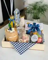 DESAYUNO SORPRESA COMPUESTO POR OMELETTE (MADURO, MAIZ Y TOCINETA) BEBIDA FRIA (JUGO), BEBIDA CALIENTE ( CHOCOLATE9, PORCION DE FRUTA, PAN DEL MOMENTO, POSTRE DEL DIA, VASO DECORATIVO, GALLETA O CUPCAKE, CAJA DE MADERA, GLOBO, MOÑO Y TARJETA