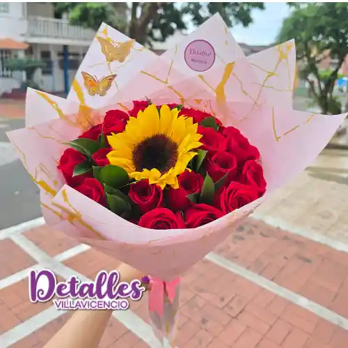 Ramo de flores redondo grande con rosas rojas, girasol en el centro, follajes, decorado con papel coreano y moños
